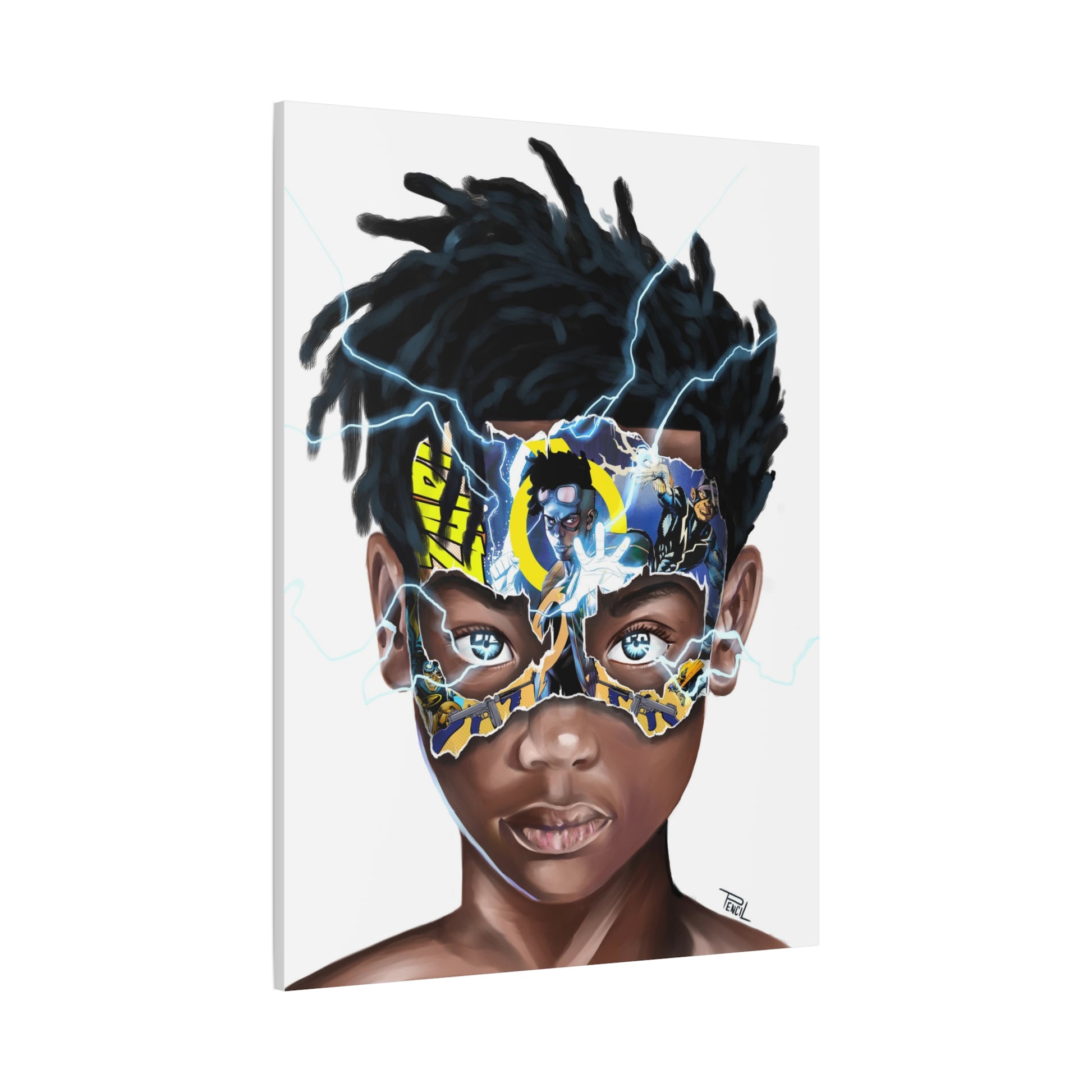 Black Lightning Boy captures the energy of youth, power, and limitless potential. Surrounded by the force of lightning, the young figure symbolizes strength, brilliance, and the spark of greatness that lives within the next generation.